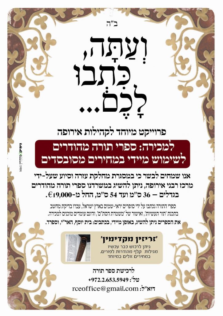 לאחר שלושה שבועות של משא ומתן עם סוחרים וסופרים בארץ ישראל ובאירופה, אגף עזרה וסיוע במרכז רבני אירופה שמחים לבשר כי הגענו להסכם ייחודי עם אחד מגדולי סוחרי ספרי התורה בארץ ישראל.